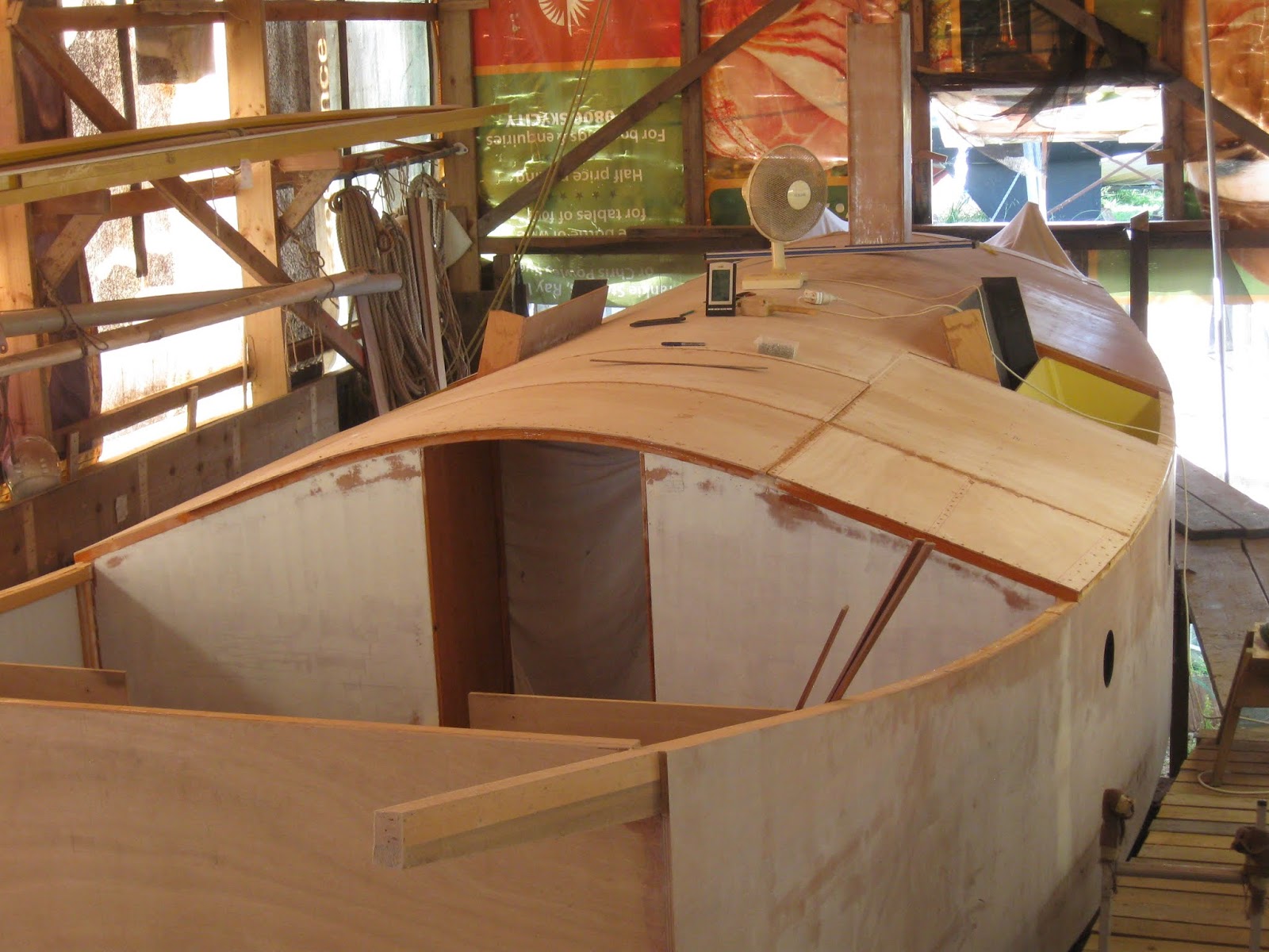 By coincidence, just this afternoon Marcus and I were discussing the failure of the plywood deck on the old scow I built 50 years ago. (I did not make the deck, the next owner did it). It was a single skin deck, with butt joins landed on bulkheads. The bulkheads are actually 3.5 inches thick so no butt straps were used. 40 years later cracks appeared at all these joins – and later, rot set in. Bulkheads are hard spots of course, and I think the joins would have been better between the bulkheads, and done with plywood butt straps. To make matters worse, the deck was then just dressed with canvas and paint.